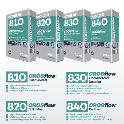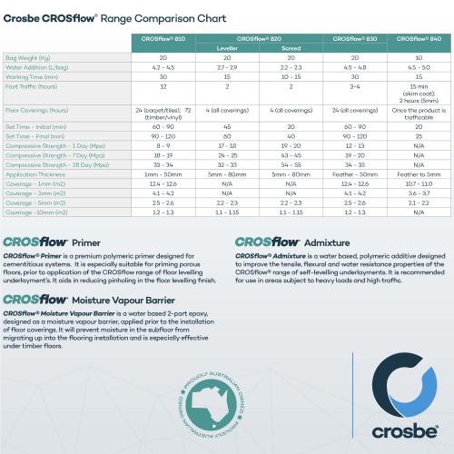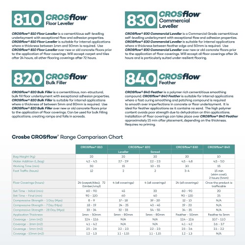 A 20-kilogram bag of CROSflow® 830 will cover approximately 4.1 m2 with a thickness of 3 mm and 2.5 m2 with a thickness of 5 mm.