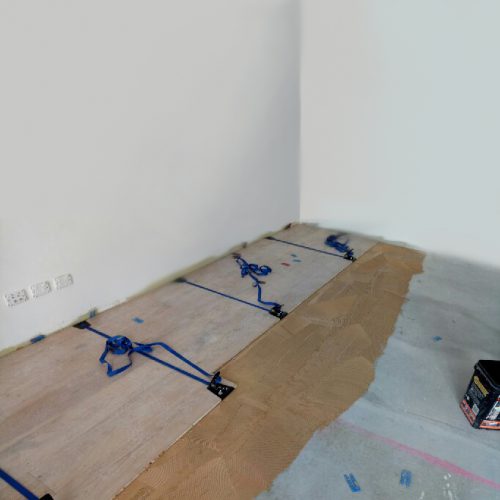 3) Place strips of “14 days” blue painters tape across the newly install rows of flooring, spaced 45 – 60 cm or so, and overlapping the previous sections of boards by one or two rows. This will hold the boards tightly together until the flooring adhesive dries.